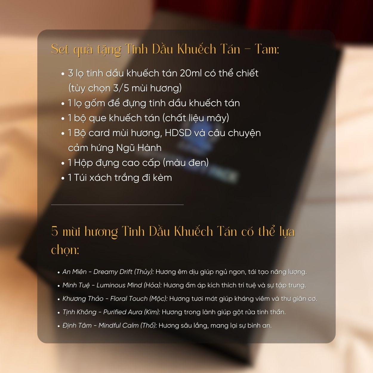Set Tinh Dầu Khuếch Tán - Tam (3) là sản phẩm thuộc BST Tinh Dầu Khuếch Tán - cảm hứng Ngũ Hành. Với công dụng chăm sóc sức khỏe tinh thần và thể chất dựa trên công dụng trị liệu vượt trội của các loại tinh dầu hữu cơ bản địa.