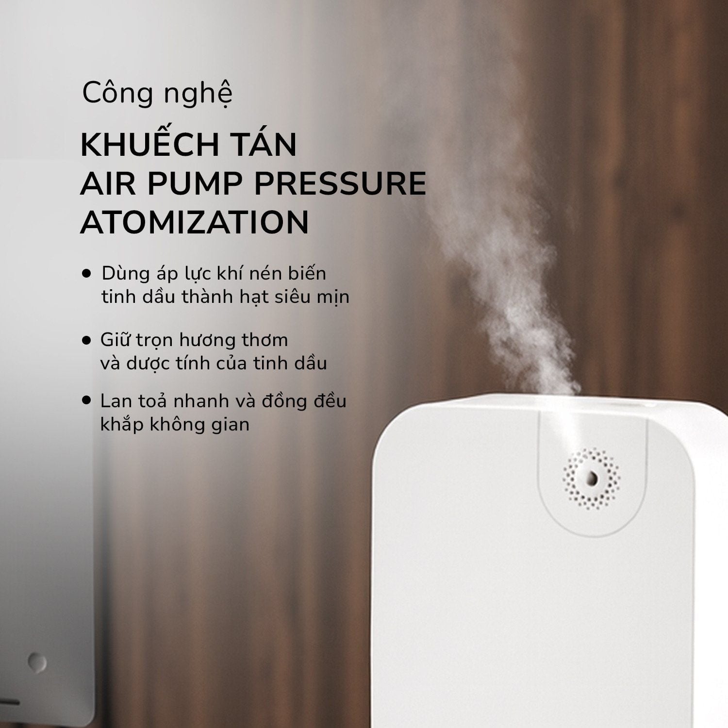 - Công nghệ khuếch tán Air Pump Pressure Atomization: sử dụng áp lực khí nén để biến tinh dầu nguyên chất thành hạt sương siêu mịn, lan tỏa nhanh và đồng đều khắp không gian, giữ trọn vẹn dược tính của tinh dầu.